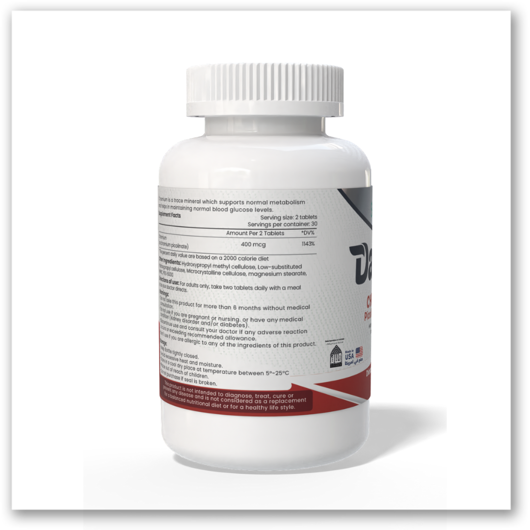 الكروميوم في شكل بيكولينات يضمن امتصاصًا فائقًا، مما يجعله أكثر فعالية في تعزيز استخدام الطاقة، الحفاظ على التحكم الصحي في الجلوكوز، والتحكم في الوزن.