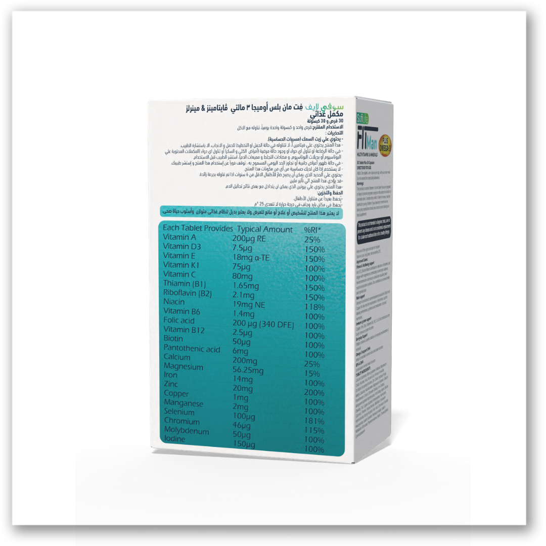FIT Man Plus Omega 3 enhances men’s overall wellness with a comprehensive blend of 23 essential vitamins and minerals, combined with Omega-3 for sustained energy, vitality, and daily support for both heart and cognitive health.